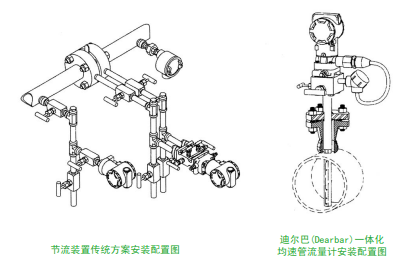 HD-215智能流量轉(zhuǎn)換器可同時(shí)實(shí)現(xiàn)差壓轉(zhuǎn)換及流量顯示和累積,在流體溫度不高的情況下如與迪爾巴(Dearbar)探頭組合成一體化結(jié)構(gòu),可減少使用引壓管而引起的泄漏、差壓信號(hào)失真(很多場(chǎng)合小流量時(shí)差壓信號(hào)都很小,可能只有20~30Pa)等問題,大大提高了測(cè)量精度,同時(shí)也降低了使用成本。下面是差壓節(jié)流裝置傳統(tǒng)方案與迪爾巴(Dearbar)一體化均