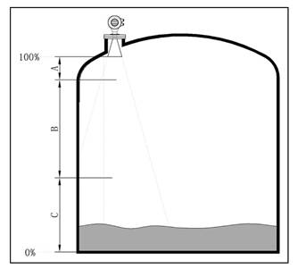 若介質(zhì)為低介電常數(shù)當(dāng)其處于低液位時(shí),罐低可見,此時(shí)為保證測(cè)量精度,建議將零點(diǎn)定在低高度為C 的位置。